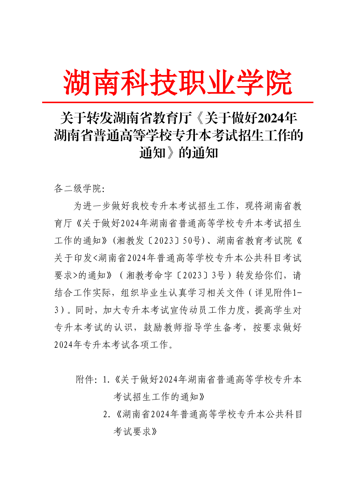 附件1:关于做好2024年湖南省普通高等学校专升本考试招生工作的通知.pdf