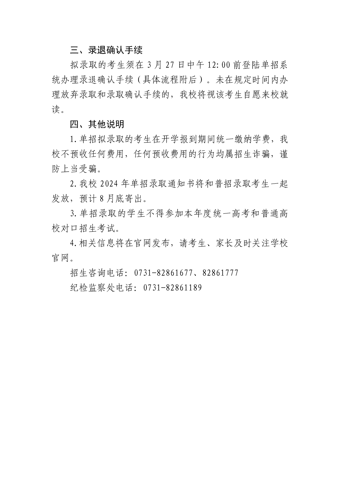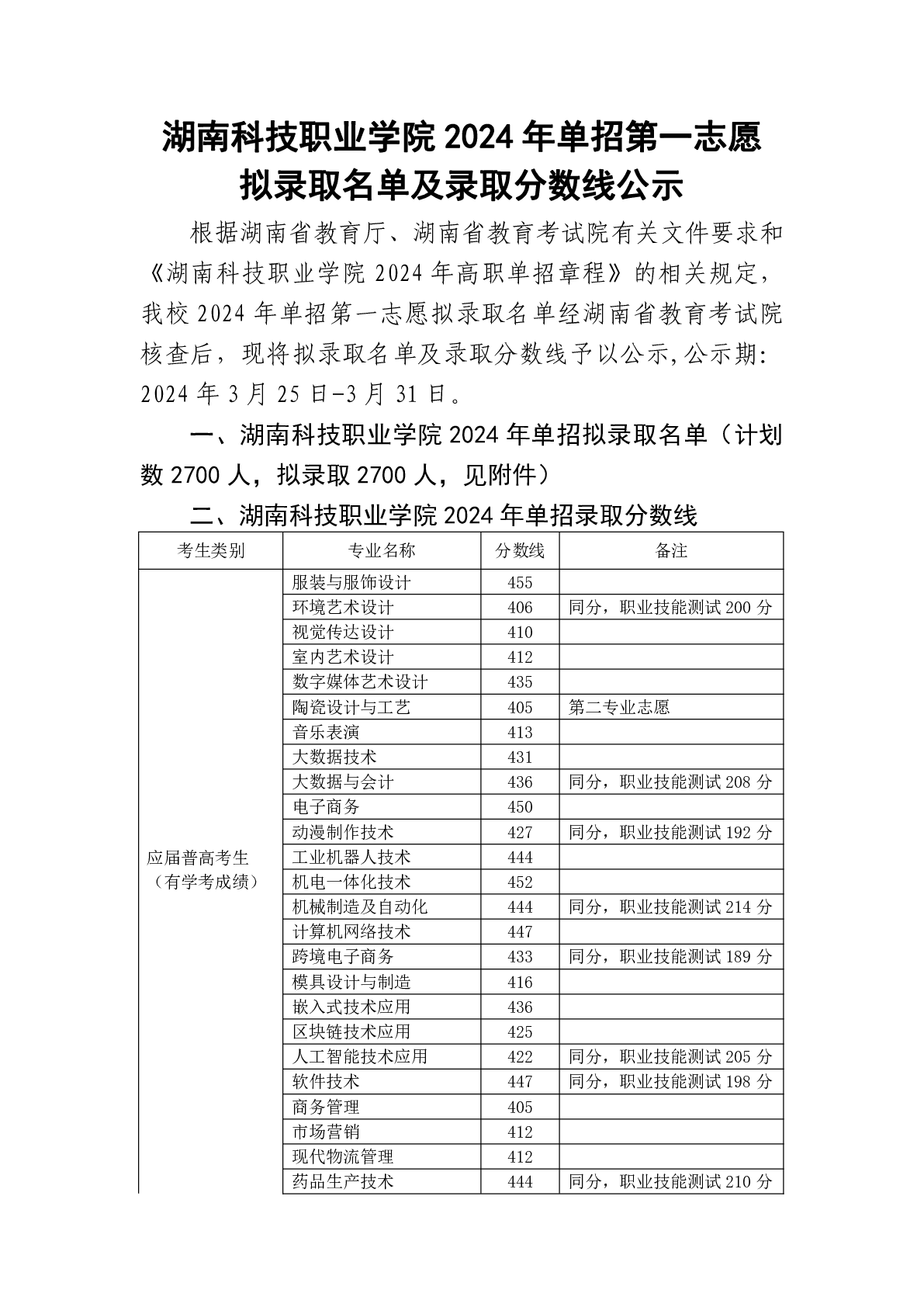 湖南科技职业学院2024年单招第一志愿拟录取名单及录取分数线公示