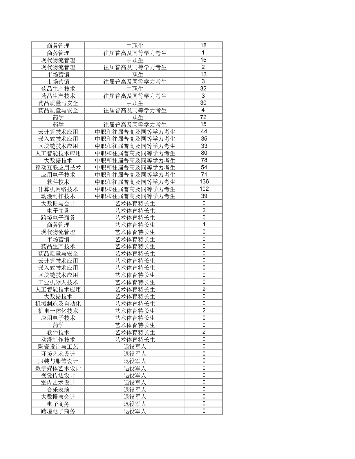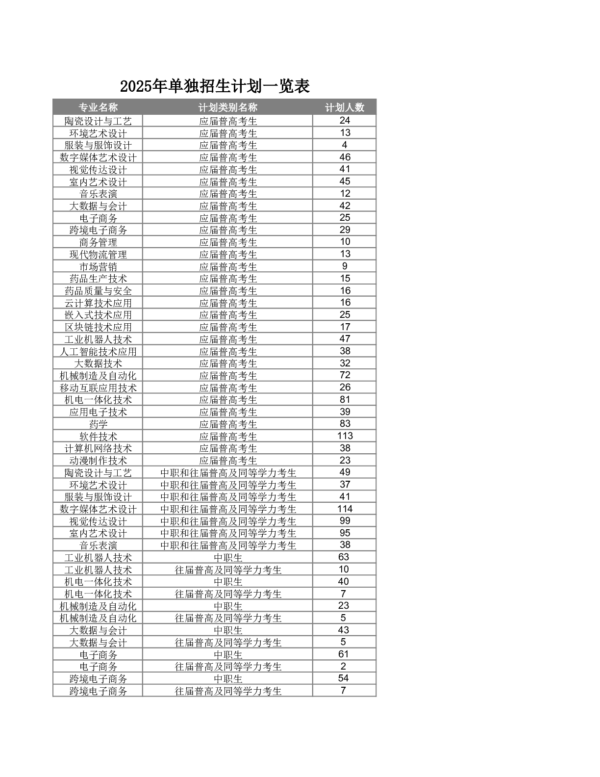2025年单独招生计划一览表