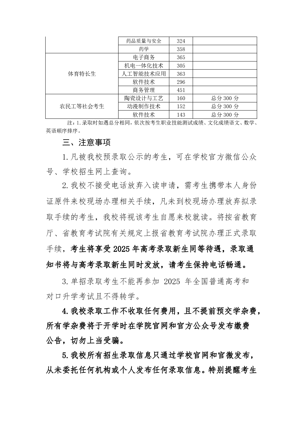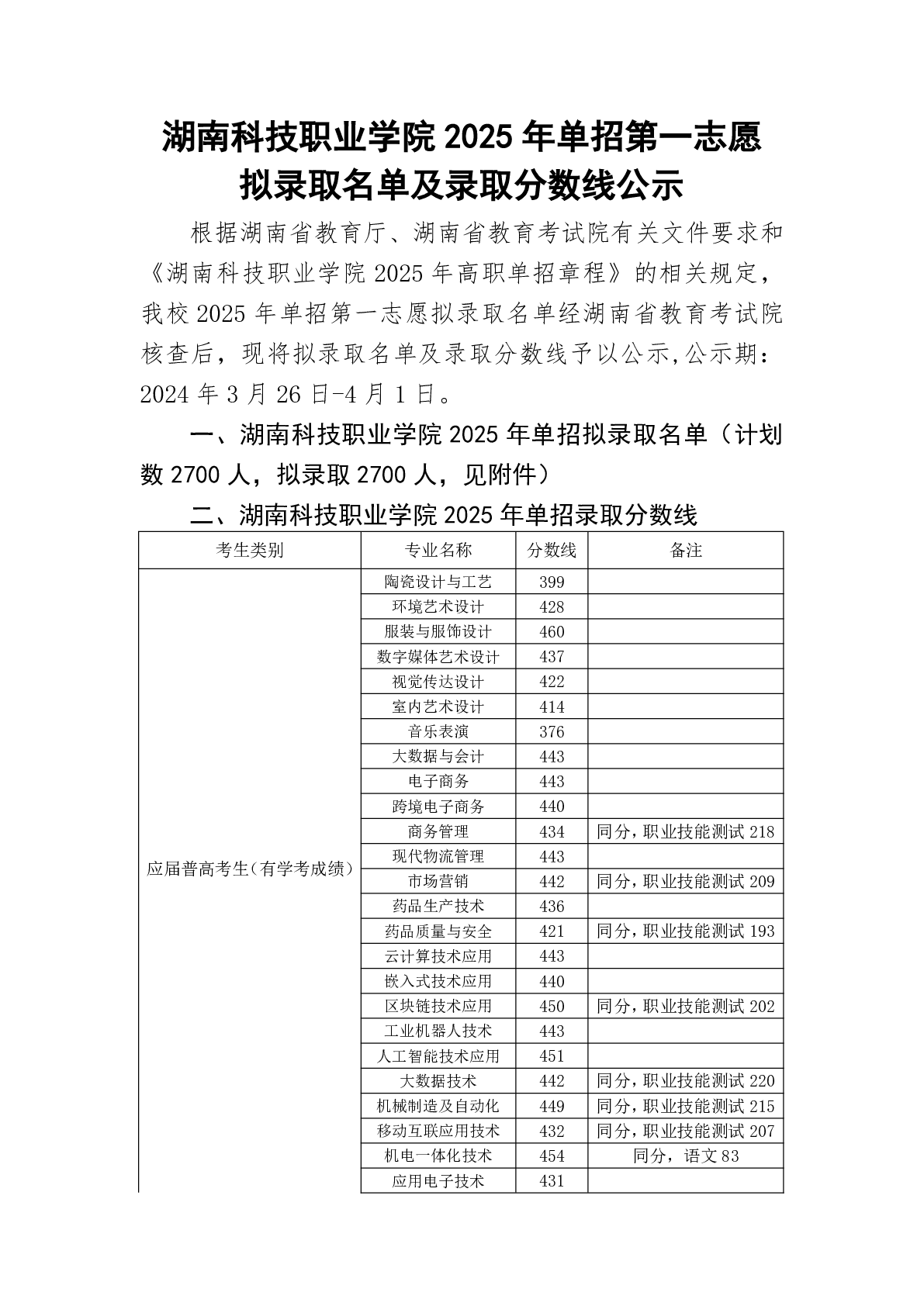 湖南科技职业学院2025年单招第一志愿 拟录取名单及录取分数线公示